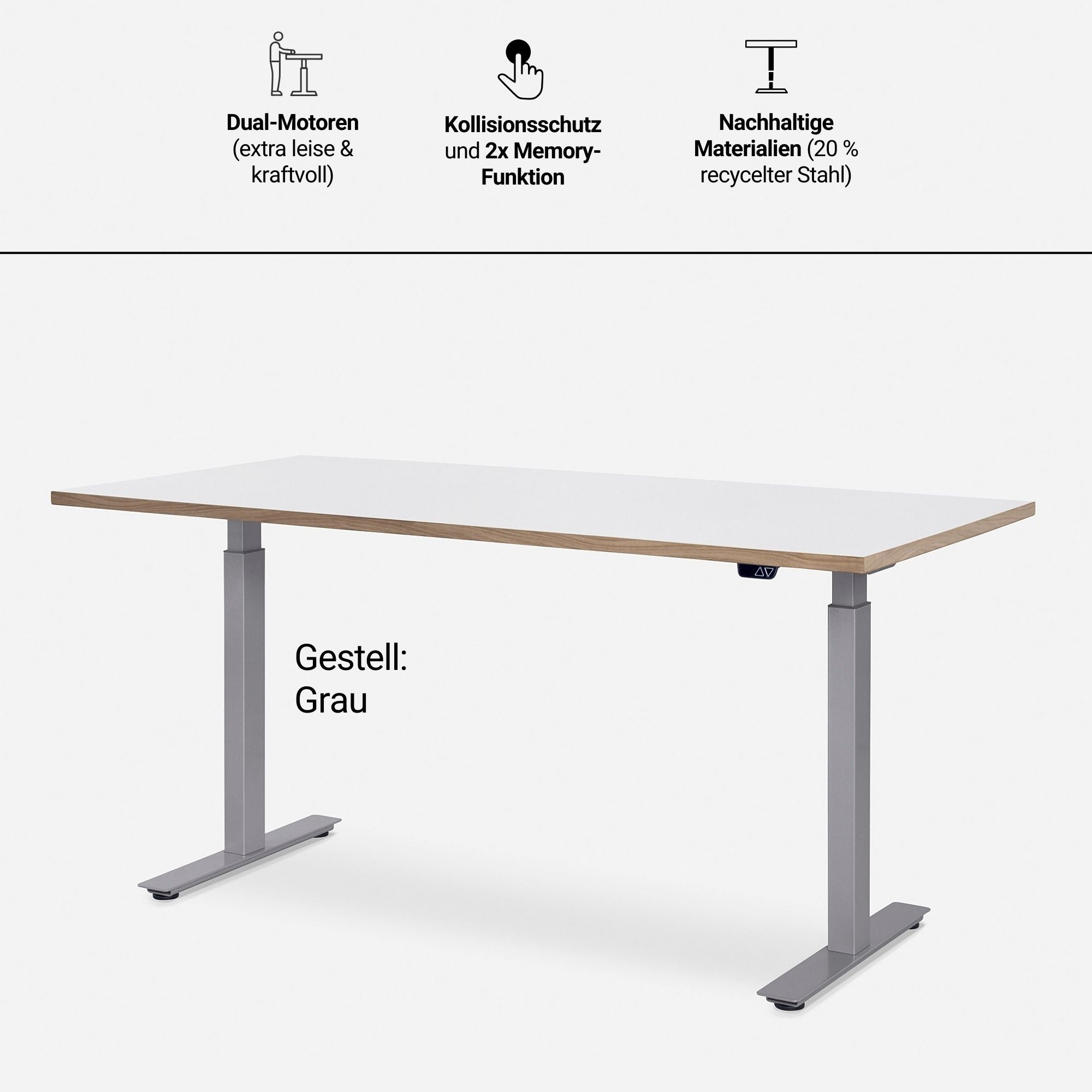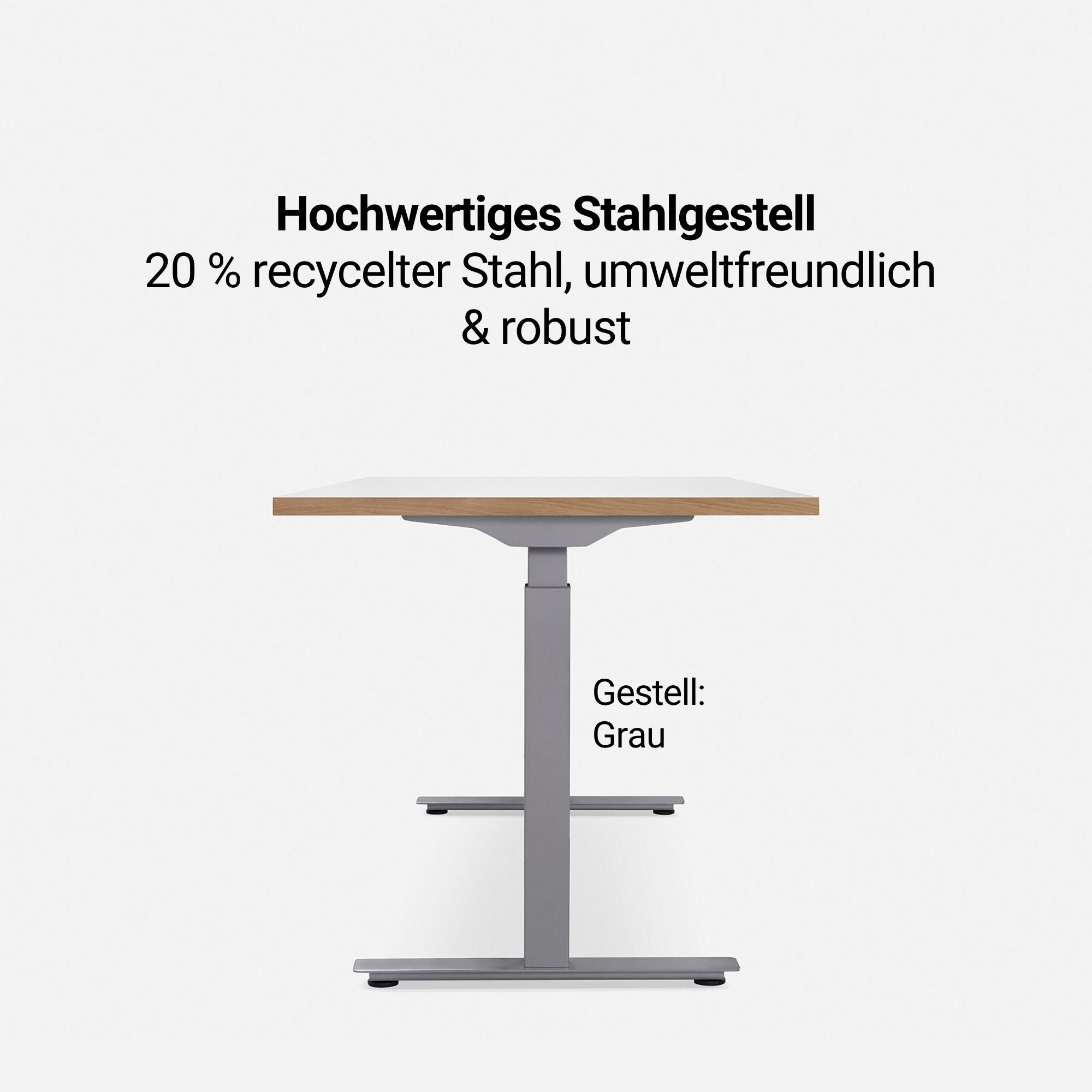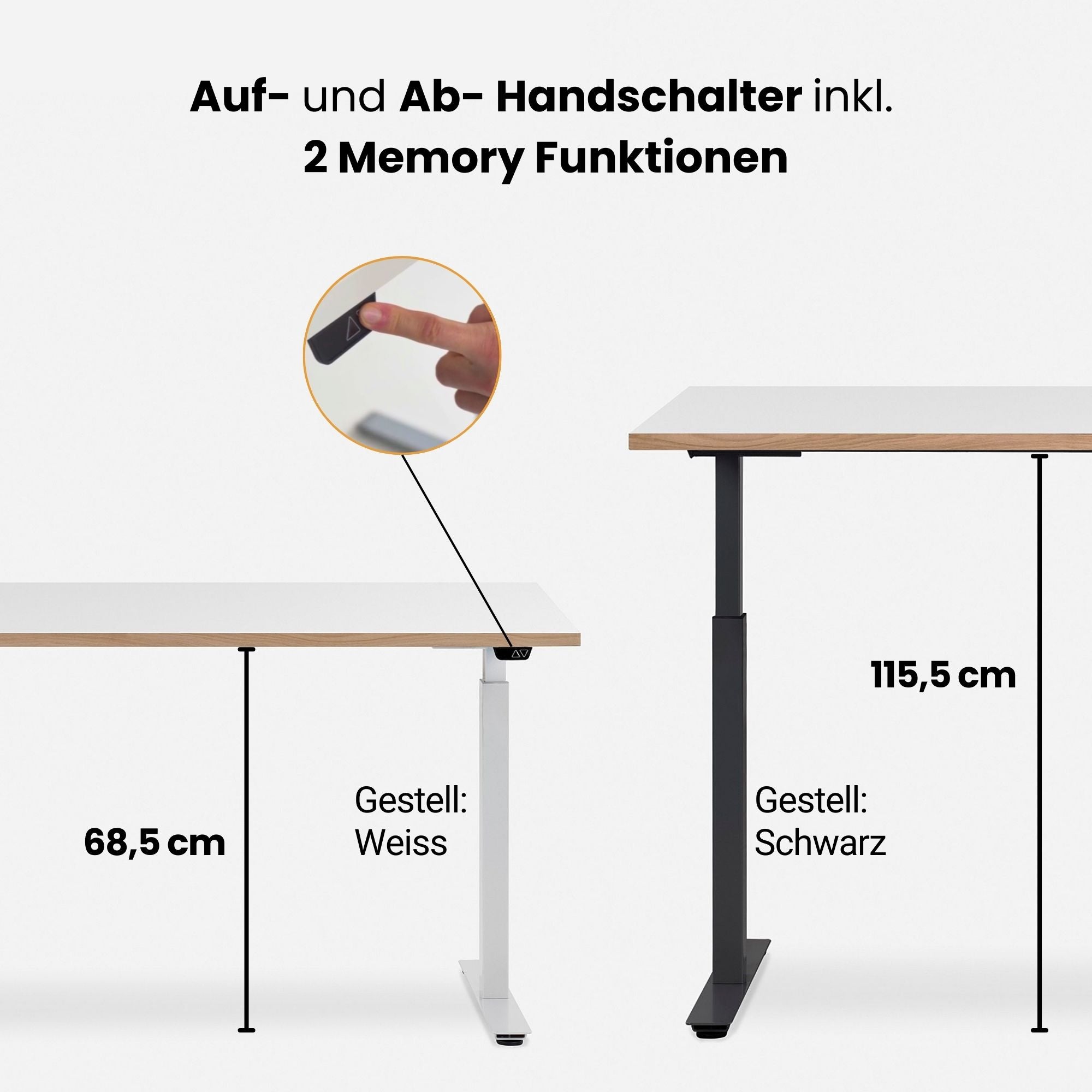 Im WRK21® Schreibtisch trifft die Zukunft des Arbeitens auf intelligente Technologie. Unser Schreibtisch ist mit smarten Features ausgestattet, die deinen Arbeitsalltag revolutionieren. Das elektronische Höhenverstellsystem ermöglicht müheloses Wechseln zwischen Sitzen und Stehen, und die Bedienelemente sind so einfach wie intuitiv. Der integrierte Kollisionsschutz sorgt für Sicherheit und verhindert unerwünschte Unfälle. Mit dem Handschalter, der ein Display und eine Memory-Funktion bietet, hast du die volle Kontrolle über deine Arbeitsposition.